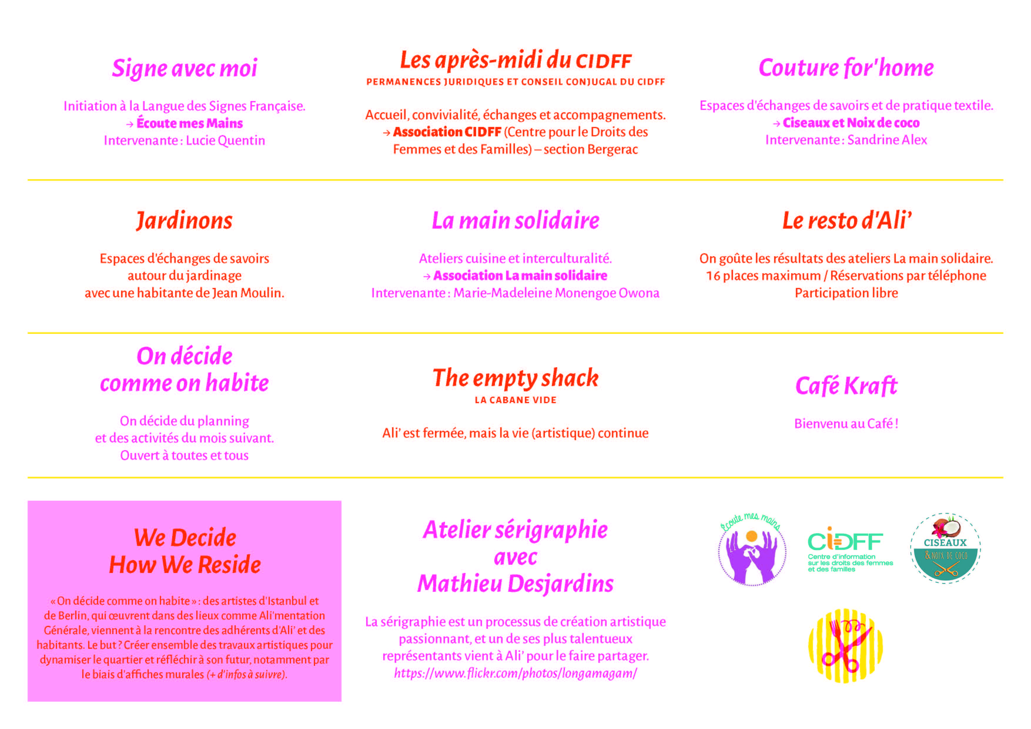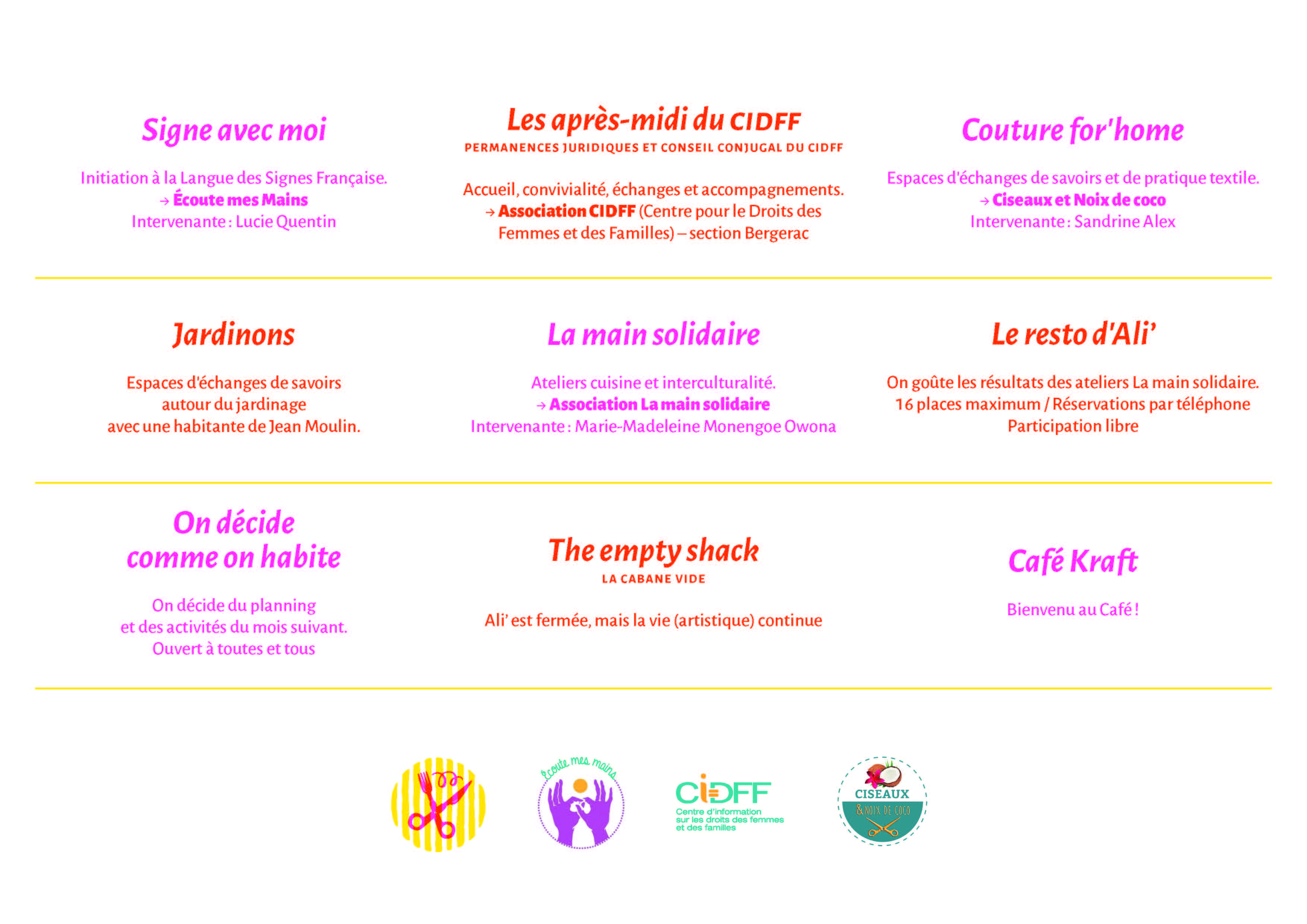 Après-midis du CIDFF, ateliers « Couture For’Home », moments de convivialité et de détente, langue des signes, espaces de réflexion et résidences artistiques… Bienvenus à Ali’ !