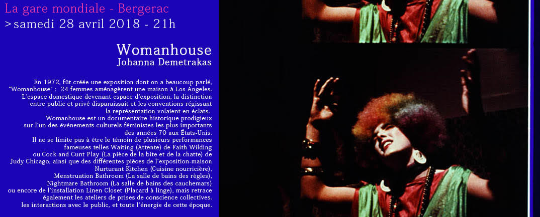 Womanhouse est un documentaire historique prodigieux sur l’un des événements culturels féministes les plus importants des années 70 aux États-Unis. Il ne se limite pas à être le témoin de plusieurs performances fameuses telles Waiting (Attente) de Faith Wilding ou Cock and Cunt Play (La pièce de la bite et de la chatte) de Judy Chicago, ainsi que des différentes pièces de l’exposition-maison Nurturant Kitchen (Cuisine nourricière), Menstruation Bathroom (La salle de bains des règles), Nightmare Bathroom (La salle de bains des cauchemars) ou encore de l’installation Linen Closet (Placard à linge), mais retrace également les ateliers de prises de conscience collectives, les interactions avec le public, et toute l’énergie de cette époque.