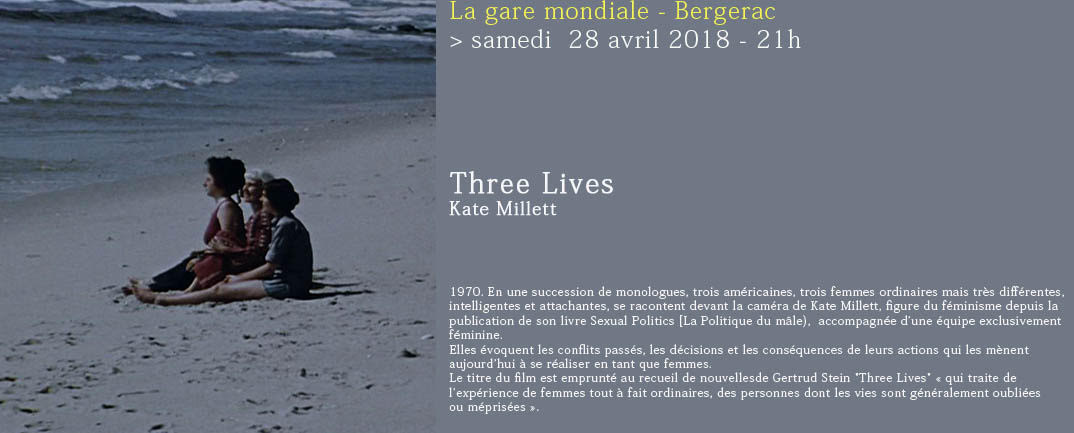 « Three Lives » de Kate Millett est un film documentaire émouvant, à la fois fier, calme et tout en agressivité contenue, tourné par une équipe exclusivement féminine sur trois femmes très différentes qui racontent avec sensibilité leur vie, des vies qui pourraient surprendre tout un chacun. » Vincent Canby, The New York Times.