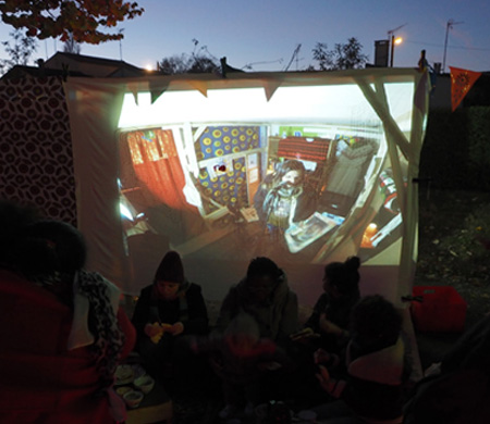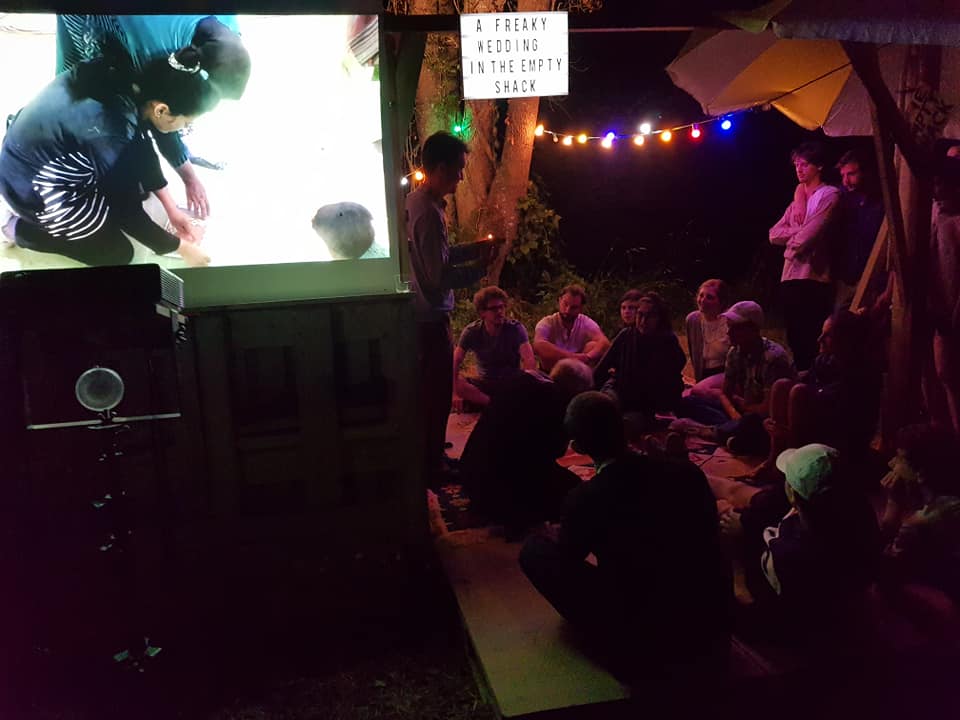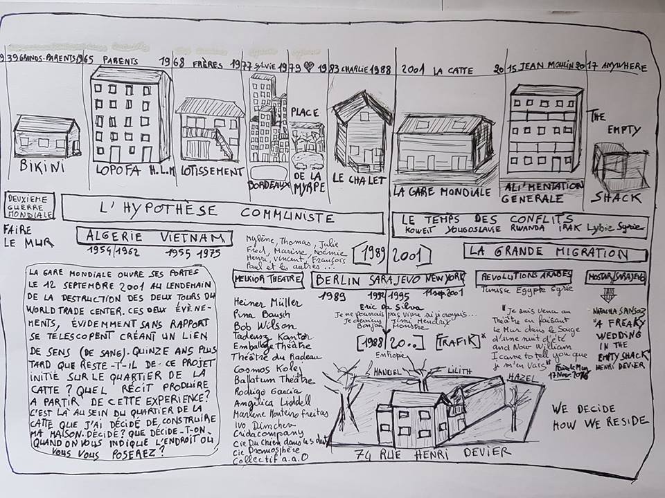 En novembre 2017 lors du festival, cette cabane se donnait à voir dans l’espace public pour la première fois, aux jardins partagés de Jean Moulin. Elle faisait partie du projet européen « We Decide How We Reside« , aux côtés des travaux de Stefan, Julia (Berlin), Seçil et Ekmel (Istanbul), et des habitant-e-s du quartier. Les premiers pas de Henri, Natacha et Fred dans l’expérimentation d’un « essai d’occupation » de deux jours et une nuit (froide) avaient permis de nombreuses rencontres, une performance culinaire et la projection des premiers films. On y discutait – déjà – de ce qui fait que l’on peut agir sur son cadre de vie, l’améliorer concrètement.