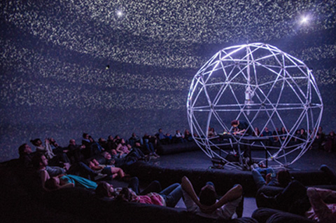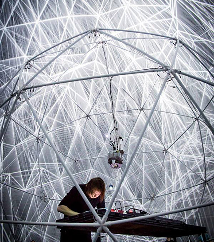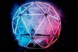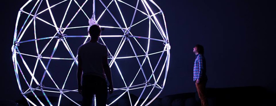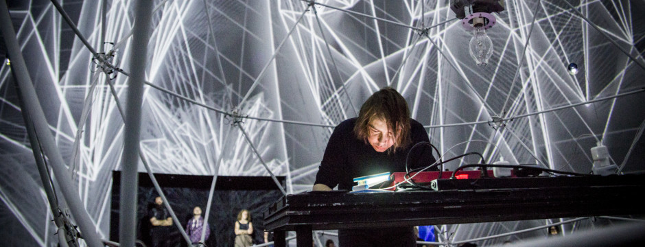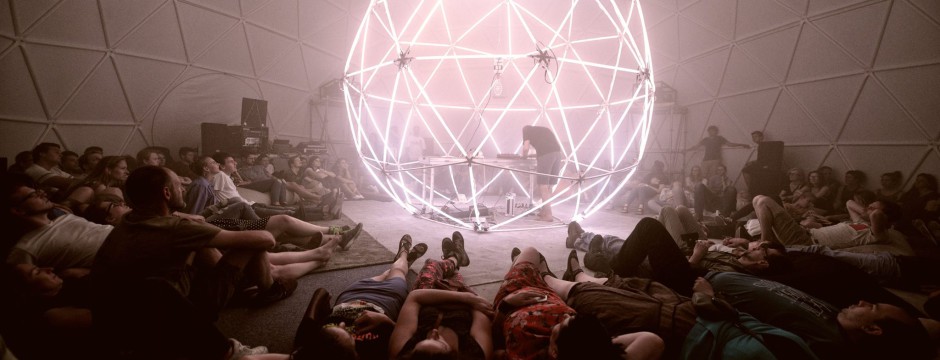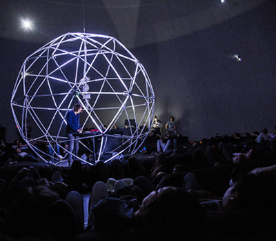 « Entropia est une performance immersive basée sur la synergie entre le son surround, la lumière directe d’un objet physique et des projections 360°. Elle consiste en une sphère géodésique placée au sein de l’espace de performance dont le mapping visuel est synchronisé au son et maintient une interaction constante avec la projection de visuels immersifs sur le dôme.