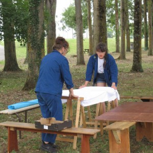 Par petit groupe, des recettes se sont imaginé, se sont expérimenté puis dégusté lors de 8 repas dressés sur une nappe toute particulière. Une nappe qui a suivi chaque expérience. Après chaque temps de cuisine, on a raconté l’histoire de ces recettes, des cuisiniers, nous avons documenté, photographié, constitué des matériaux qui ensemble ont formé une cartographie sensible de cette rencontre, de ce nouveau paysage fait d’humain. La cuisine raconte alors un nouveau territoire, celui qui émane d’une rencontre. Que reste-il de cette rencontre ? Du goût. Des visages. Des recettes et une nappe. Cette nappe singulière a voyagé de repas collectif en repas collectif et au fur et à mesure se tache. Chaque tâche est gardée et à chaque nouvelle tablée une cartographie s’est dessiné, miroir et trace de ce qui s’est partagé. Dans le même mouvement, les Ali’couseuses ont brodé les taches de la nappe à chaque étape. Les premiers ont mangé, tâché, usé, les seconds ont brodé le souvenir tout juste dégusté. Petit à petit une nappe monde a pris forme au fur et à mesure que les expériences gustatives et humaines ont été vécues.