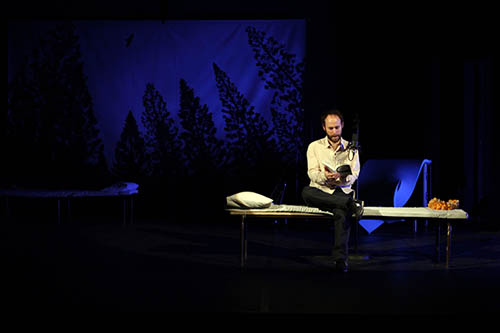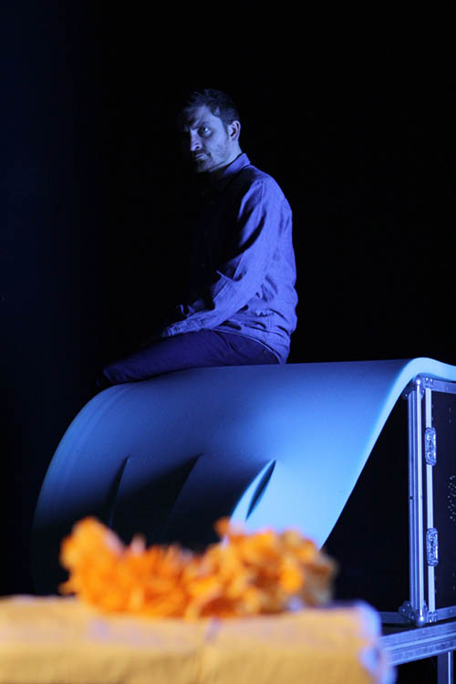 Sur la scène, c’est au tour de quelques présences amies de faire émerger de l’obscurité le théâtre mental de Gianni-Grégory Fornet, en un déroulé de paysages, surfant sur une suite musicale composée par l’auteur. Ils lisent ce livre qui raconte comment Francesco a soldé sa mémoire et comment il s’est métamorphosé. Tout cela, pendant qu’un oiseau marche et sifflote : « Il y a des voyeurs de chemin, et des hommes enfants qui ont perdu le sens. Il y a des voyeurs, et des femmes volumineuses devant eux qui dansent. Elles leur parlent du chemin en délassant leurs hanches. Elles leur montrent le chemin, puis se couvrent le sein. »