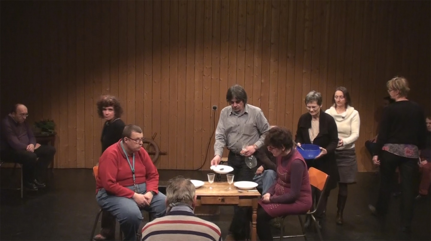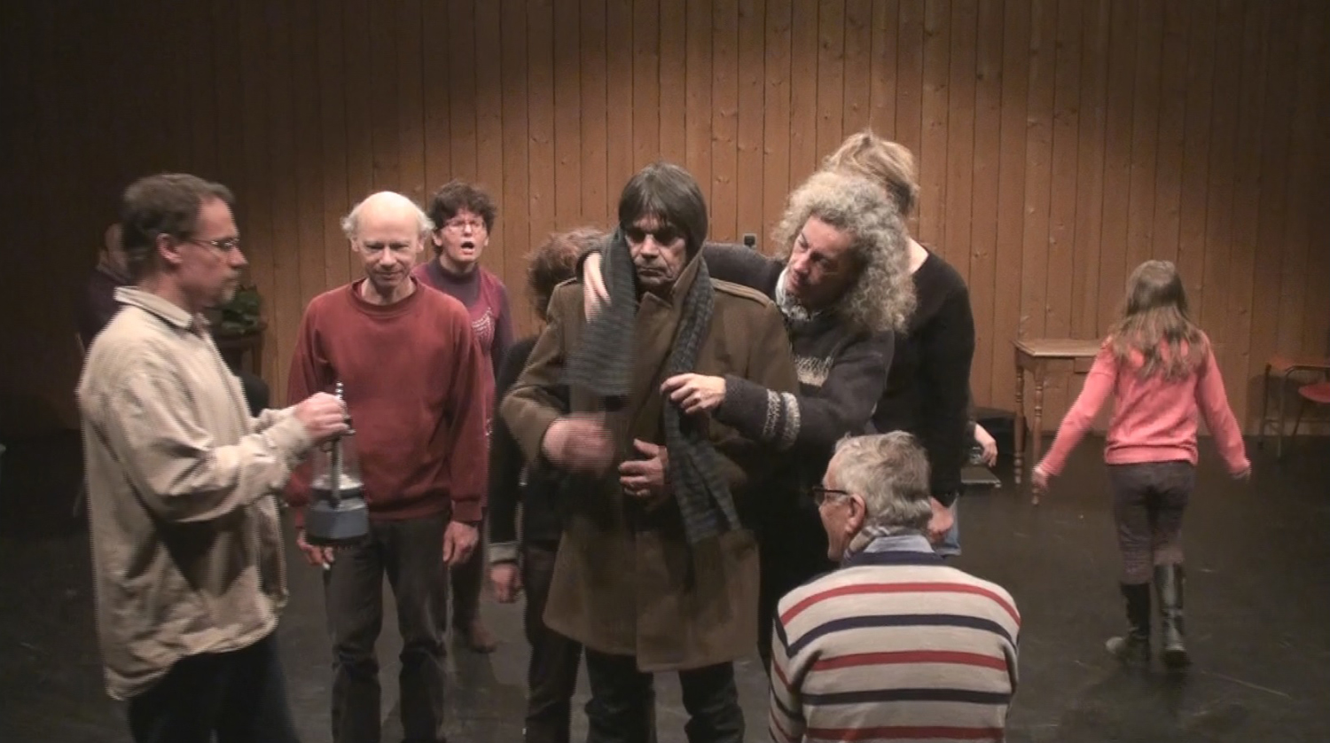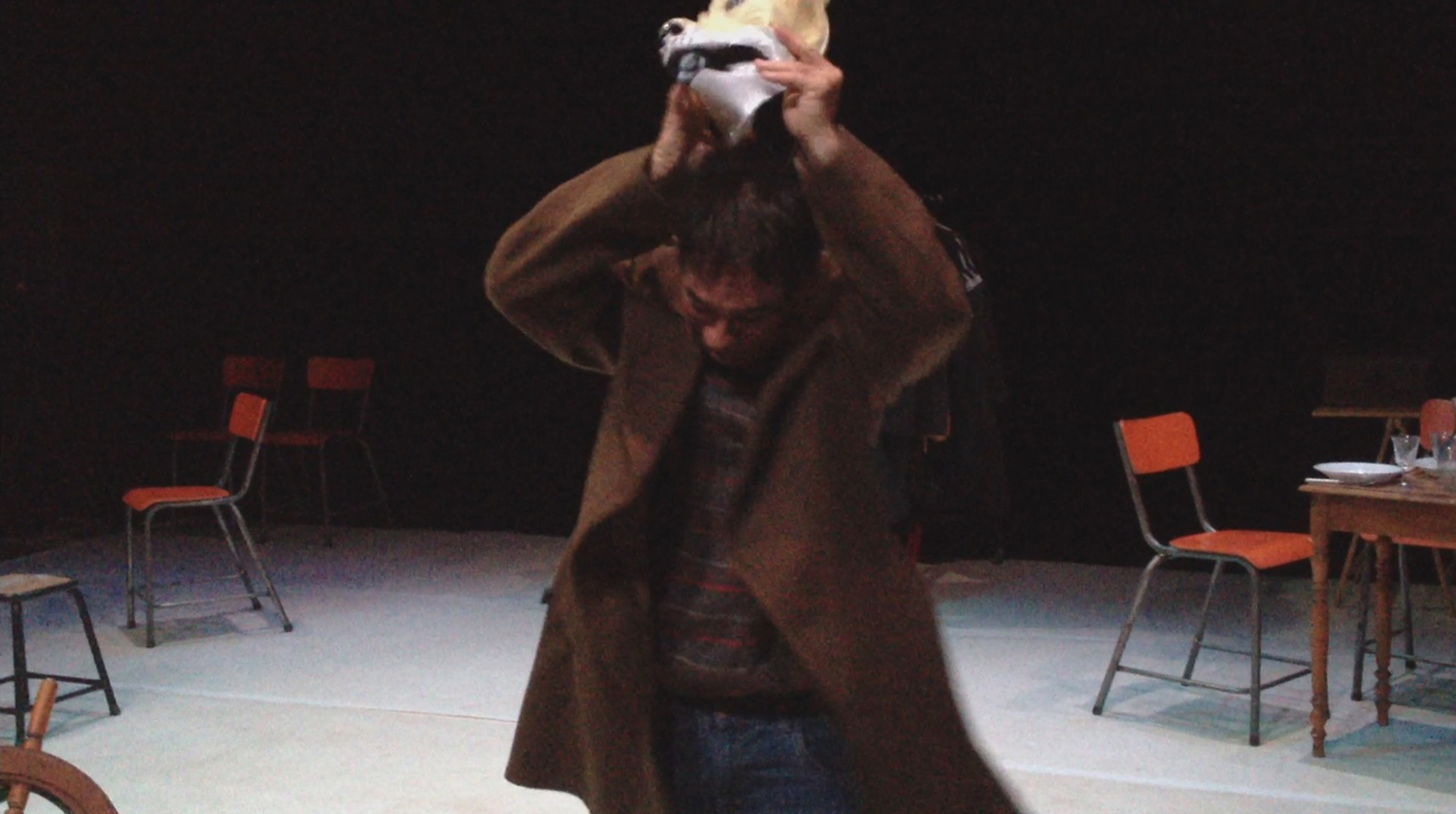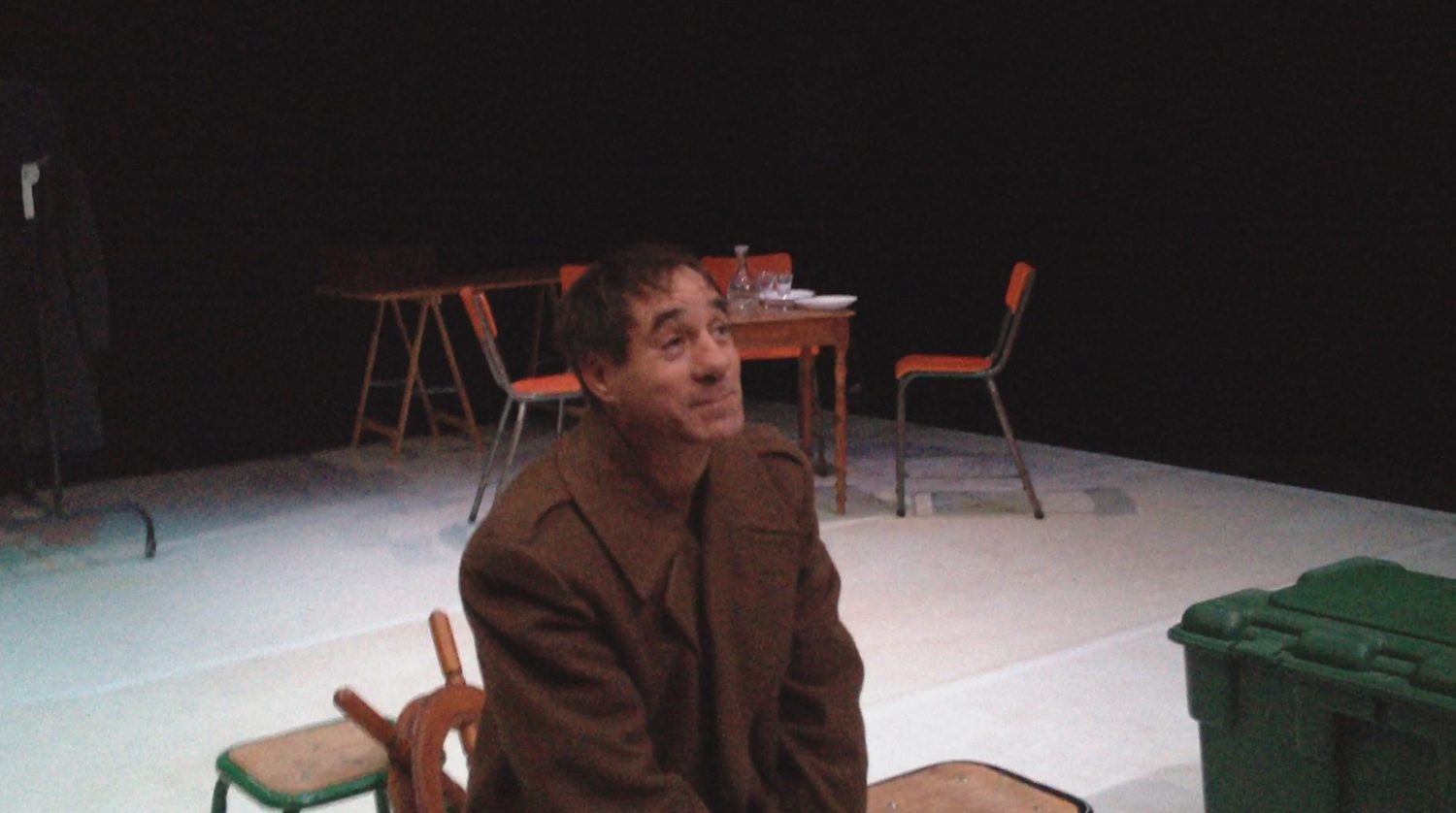 Alors moi je jouais le rôle du père/Je faisais le père avec Florence qui jouait la mère / et c’est l’histoire d’un bateau qui se ballade sur la mer / y’a une tempête de … de …l’orage, la pluie, le vent et tout ce qui suit et ça raconte l’histoire d’une famille qui est sur un bateau donc il y’a les enfants, y a le père et la mère, puis derrière y a les marins qui arrivent qui..puis y’a des gens qui vont à table, des familles qui sont à table donc euh qui voient ce bateau ce…sur la mer qui a des problèmes, de gros problèmes pour aller jusqu’à …pour rester sur la mer, sur la mer et la mer elle est en folie… je sais pas si c’est comme ça en folie… ça veut dire qu’elle est un peu forte et que les vagues qui emportent qui remportent toute la mer… donc moi je suis là/ Florence est à mes côtés c’est ça Florence hein /Tu me dis si je me trompe donc Florence joue la mère /Francis joue le fils et puis… Anaïs fait la fille et moi je vais être là donc ça raconte l’histoire d’une famille qui est sur un bateau (je le crois) sur un bateau et donc l’histoire se passe (en mer) en hiver, en hiver en plein hiver ça se passe en hiver on est sur un bateau et on va dans un pays je sais pas où je sais pas où (en Amérique ) en Amérique ou n’importe où en Amérique ou (au Canada) n’importe où… on peut aller au Canada on peut aller aux États Unis (au Brésil au Brésil) où on veut (en argentine) en Argentine voilà merci Jean Daniel (ou alors au Chili ) voilà par exemple On peut aller n’importe où en bateau… personne va pouvoir nous prendre pour autant.