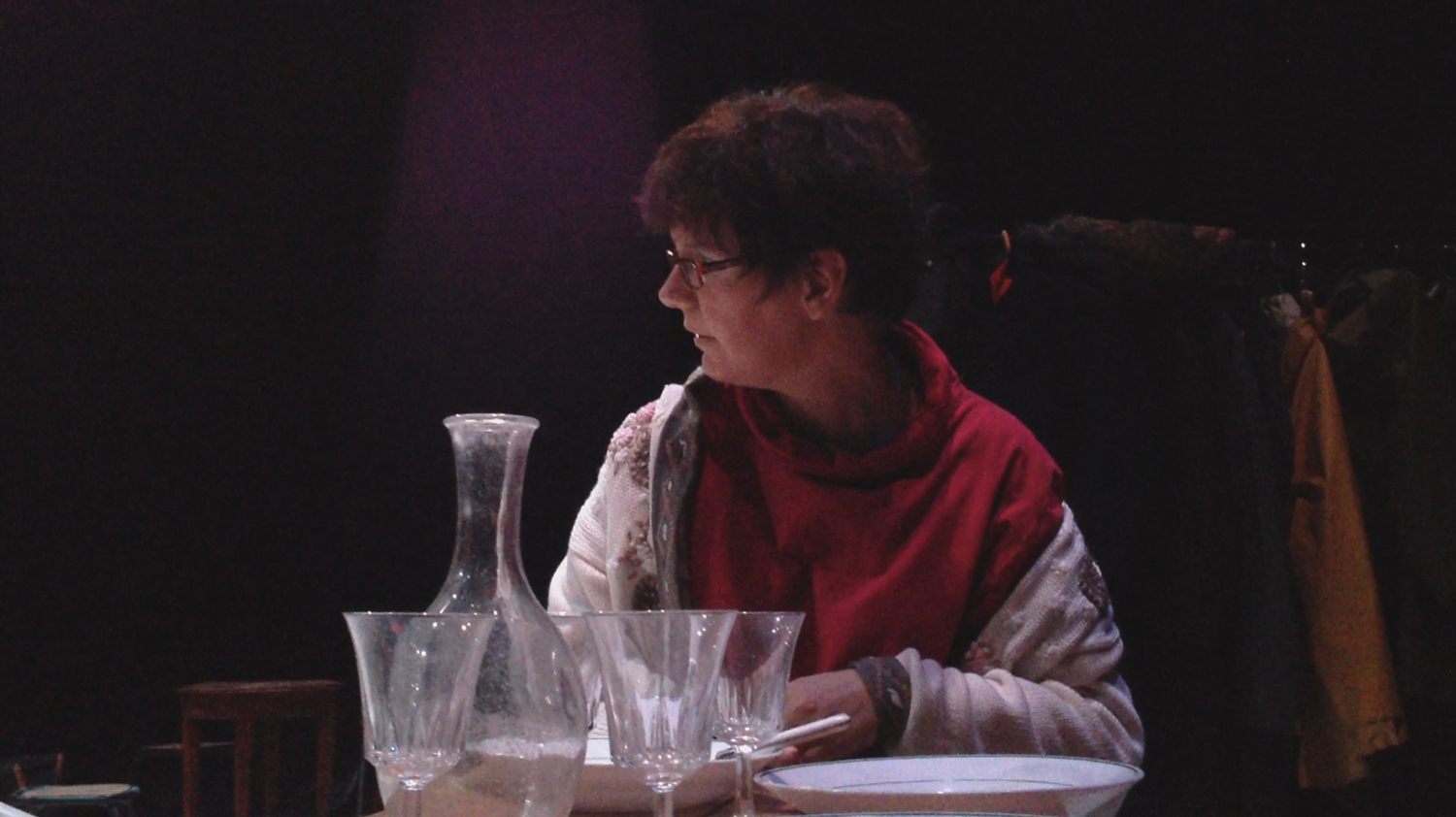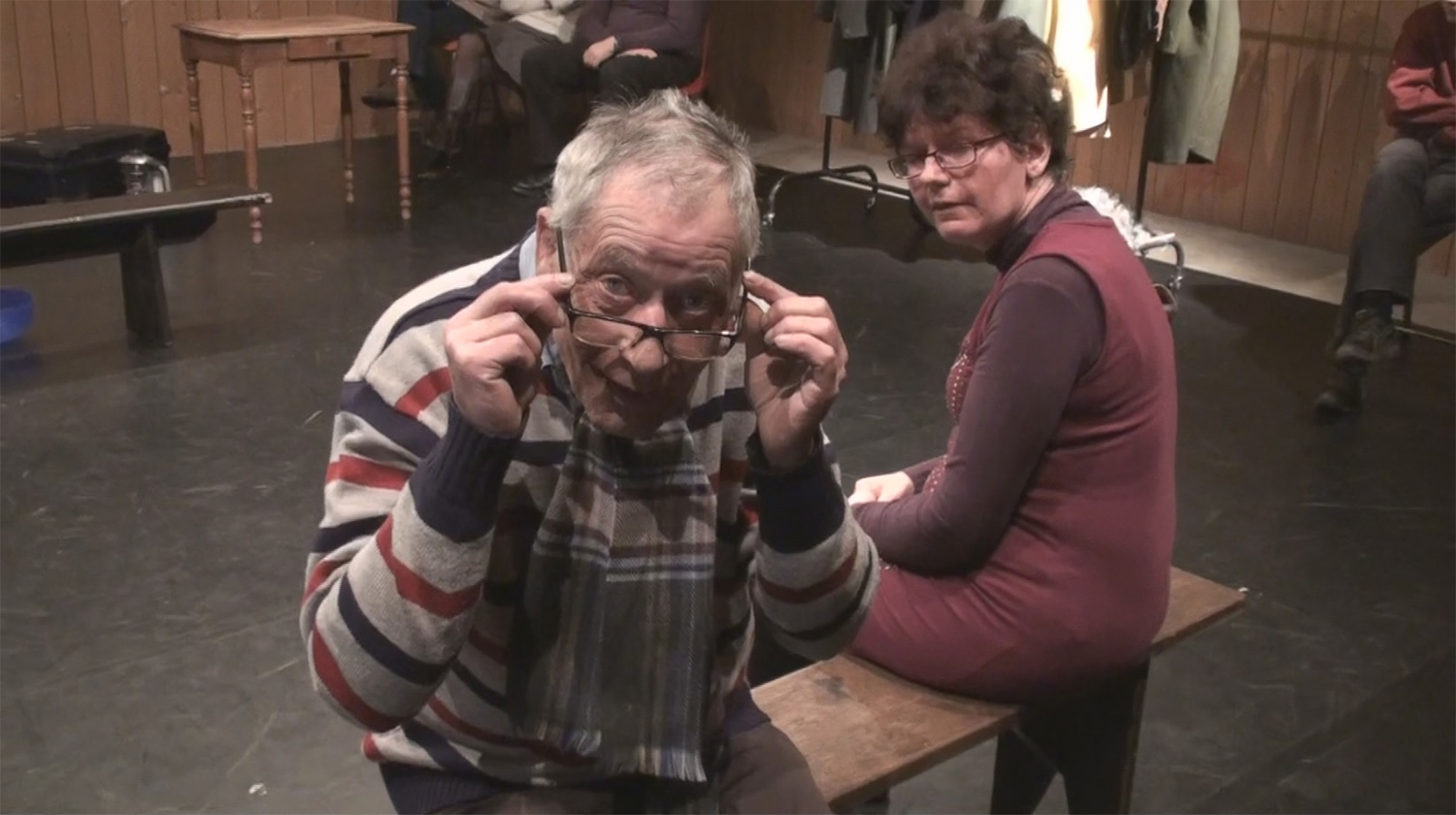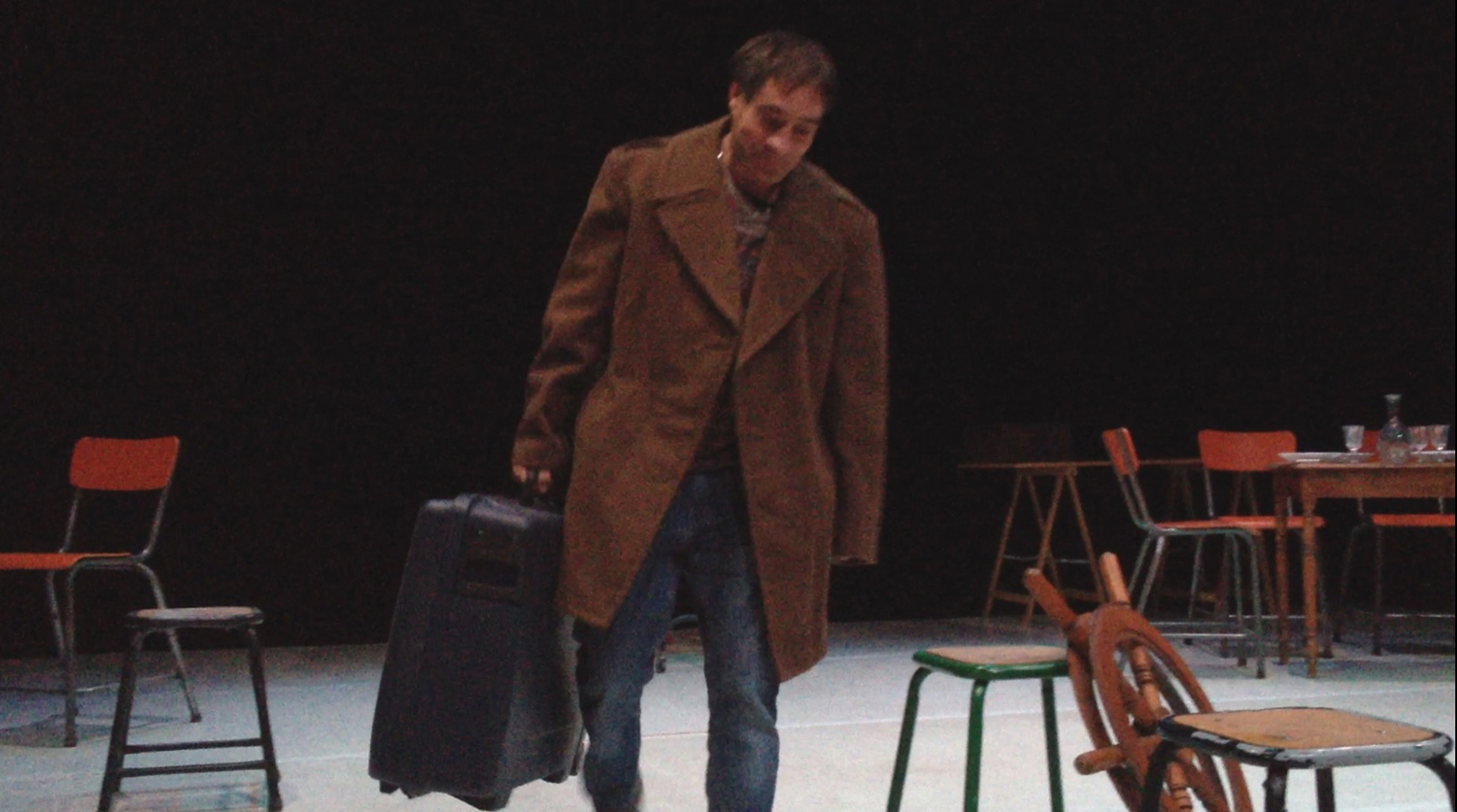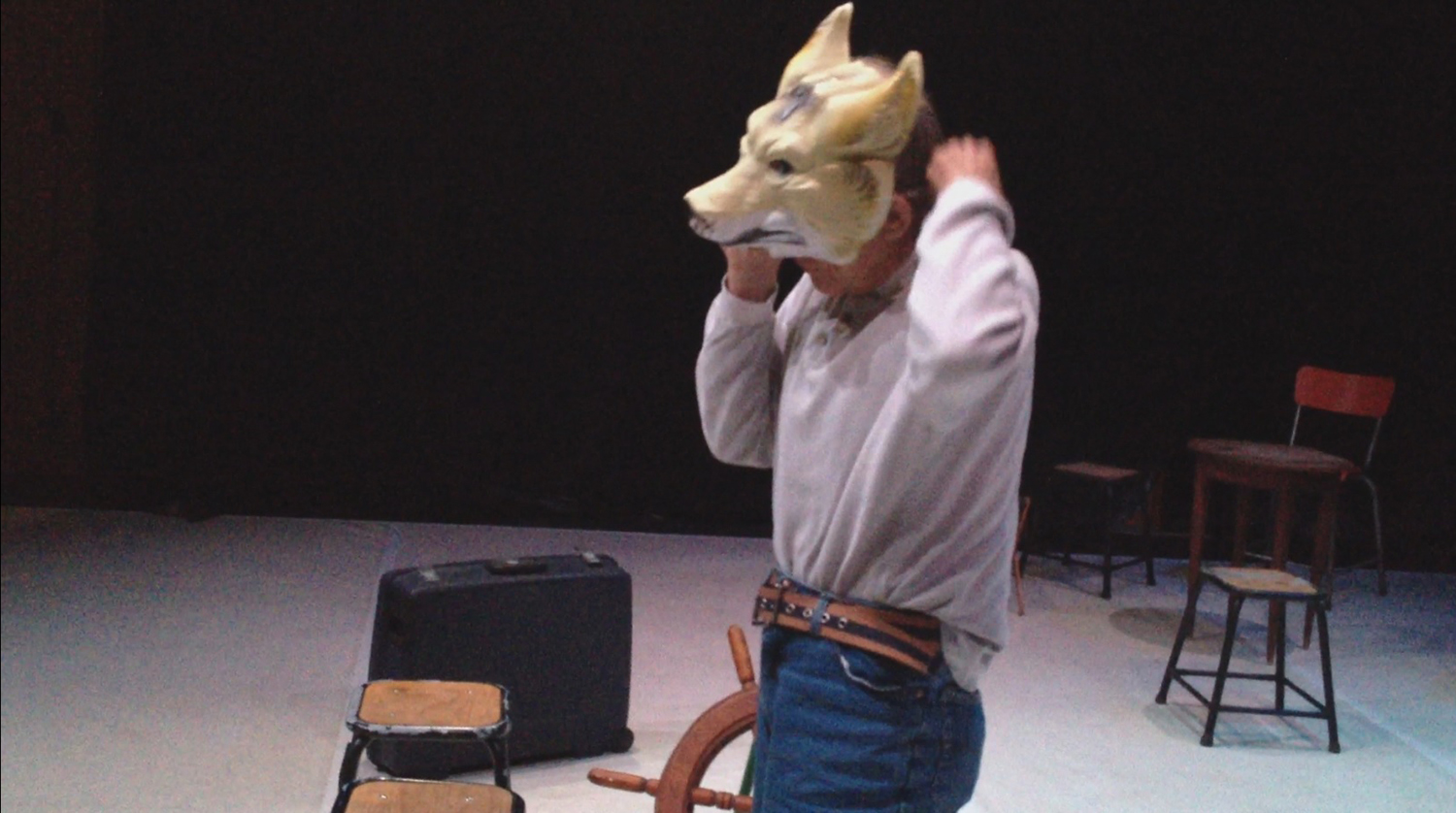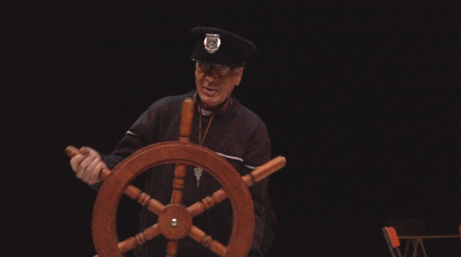 Alors moi je jouais le rôle du père/Je faisais le père avec Florence qui jouait la mère / et c’est l’histoire d’un bateau qui se ballade sur la mer / y’a une tempête de … de …l’orage, la pluie, le vent et tout ce qui suit et ça raconte l’histoire d’une famille qui est sur un bateau donc il y’a les enfants, y a le père et la mère, puis derrière y a les marins qui arrivent qui..puis y’a des gens qui vont à table, des familles qui sont à table donc euh qui voient ce bateau ce…sur la mer qui a des problèmes, de gros problèmes pour aller jusqu’à …pour rester sur la mer, sur la mer et la mer elle est en folie… je sais pas si c’est comme ça en folie… ça veut dire qu’elle est un peu forte et que les vagues qui emportent qui remportent toute la mer… donc moi je suis là/ Florence est à mes côtés c’est ça Florence hein /Tu me dis si je me trompe donc Florence joue la mère /Francis joue le fils et puis… Anaïs fait la fille et moi je vais être là donc ça raconte l’histoire d’une famille qui est sur un bateau (je le crois) sur un bateau et donc l’histoire se passe (en mer) en hiver, en hiver en plein hiver ça se passe en hiver on est sur un bateau et on va dans un pays je sais pas où je sais pas où (en Amérique ) en Amérique ou n’importe où en Amérique ou (au Canada) n’importe où… on peut aller au Canada on peut aller aux États Unis (au Brésil au Brésil) où on veut (en argentine) en Argentine voilà merci Jean Daniel (ou alors au Chili ) voilà par exemple On peut aller n’importe où en bateau… personne va pouvoir nous prendre pour autant.
