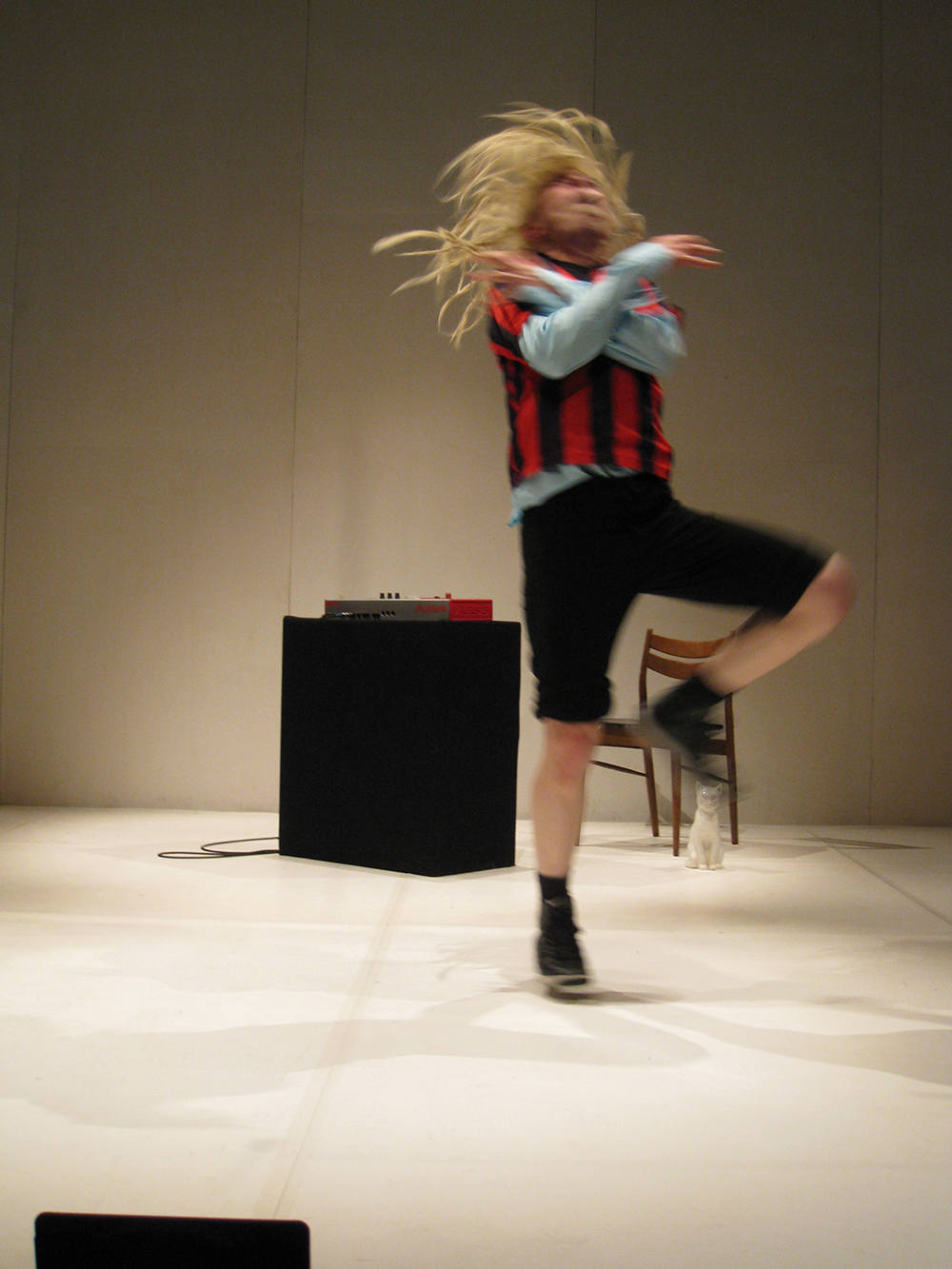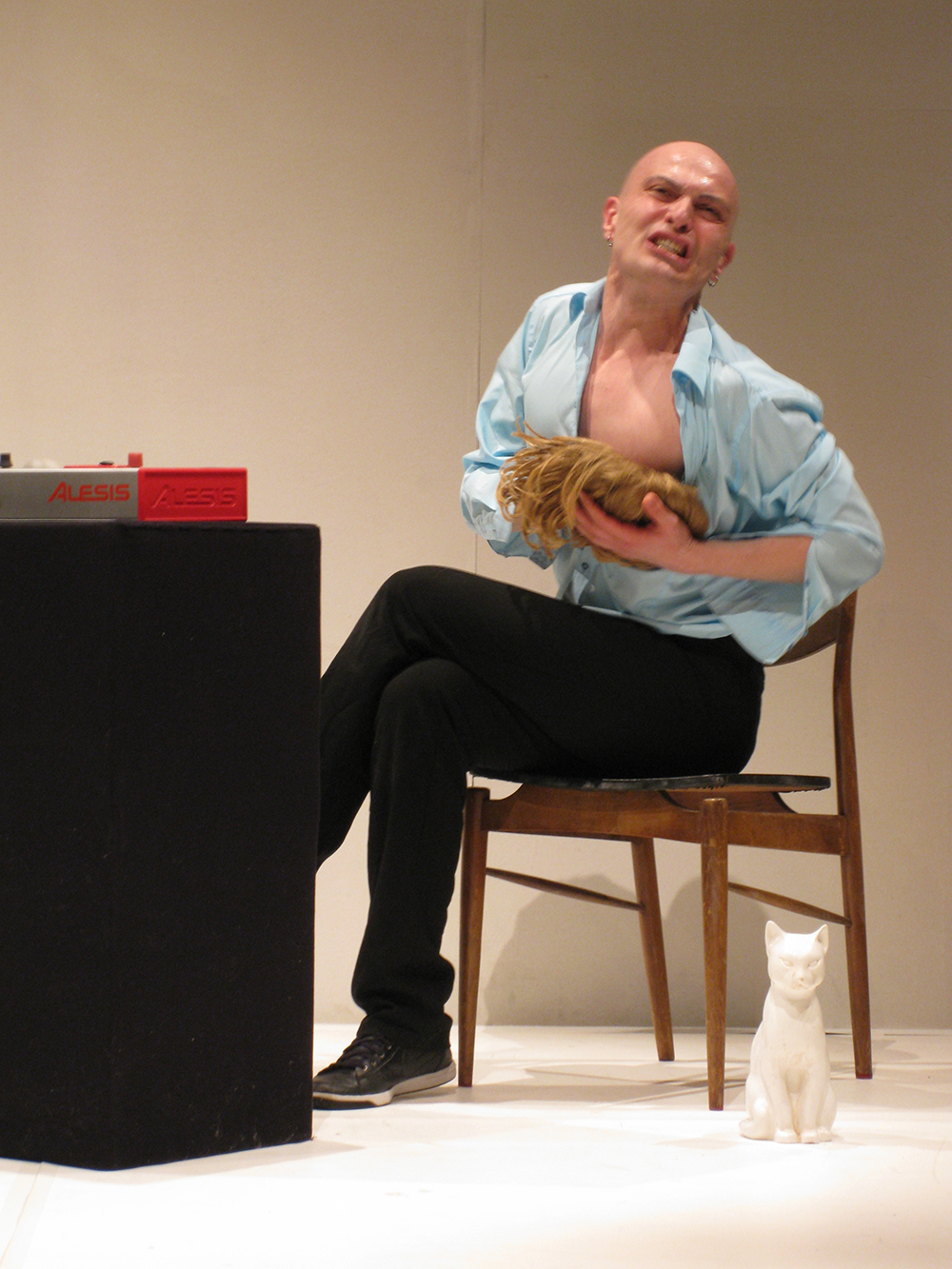 Dans un espace blanc, comme un musée, avec une boîte à rythme, un chat en porcelaine, une peinture ringarde et deux perruques, il développe des pensées folles. Et cette boîte à musique déclenche chez lui une excitation immédiate de tout le corps pour danser.