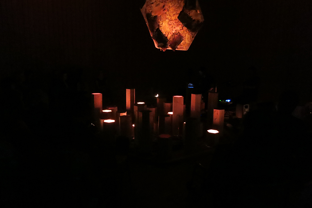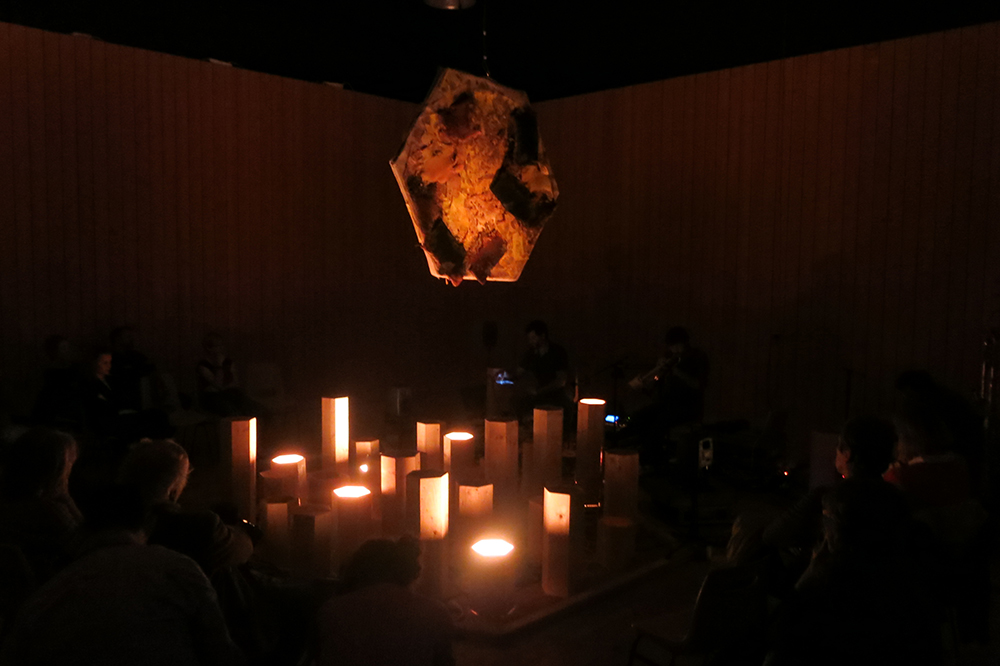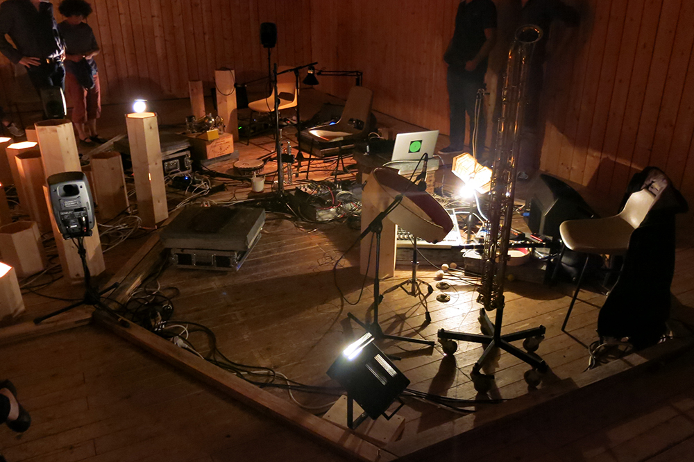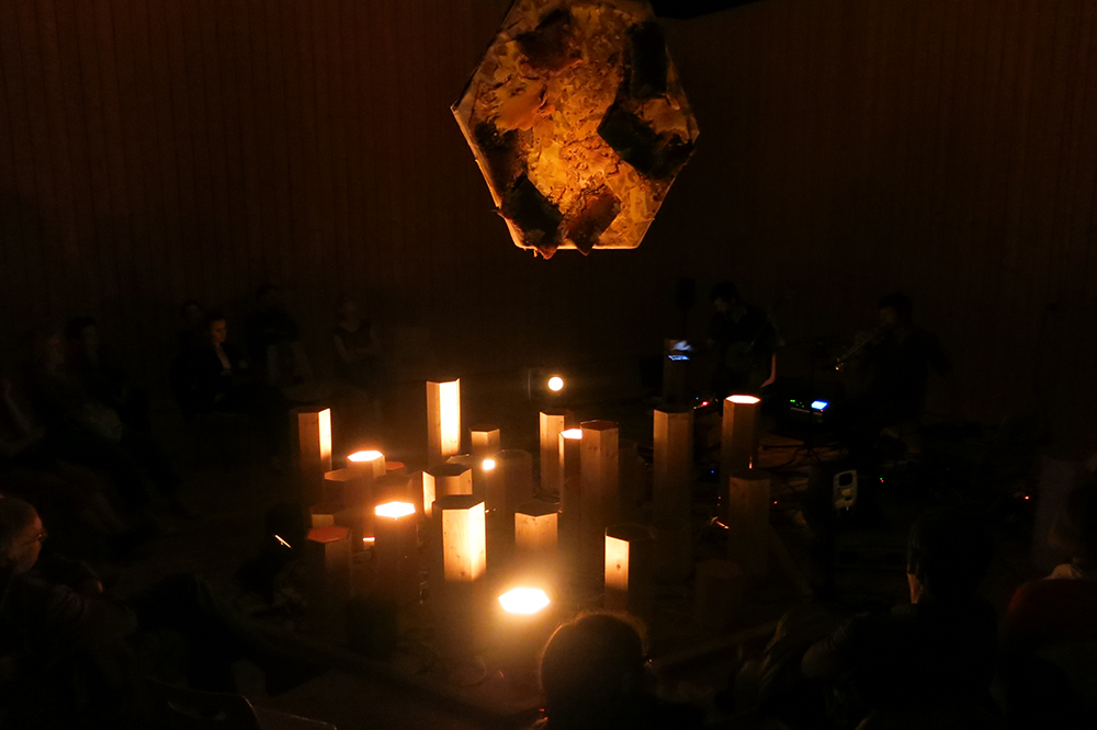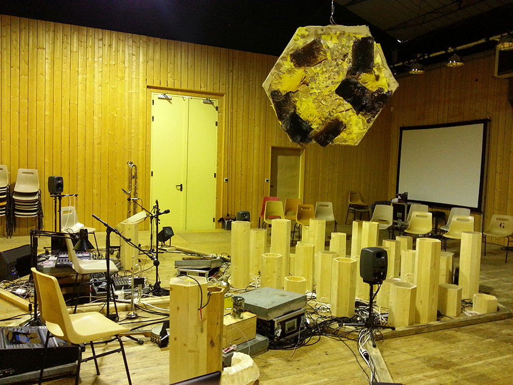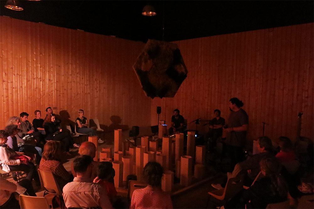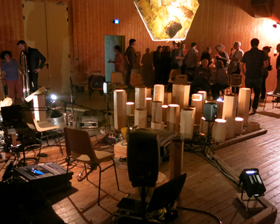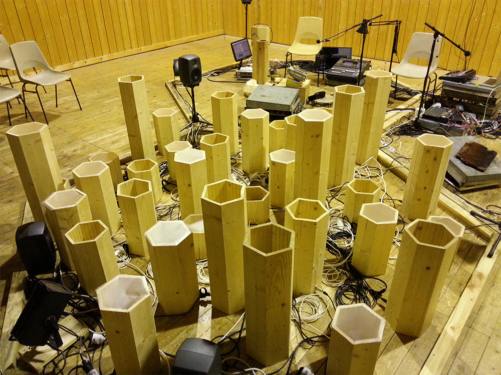 Une installation sonore et plastique est au centre d’une scénographie vivante qui permet au spectateur-auditeur une déambulation libre dans un espace sonore toujours mouvant.