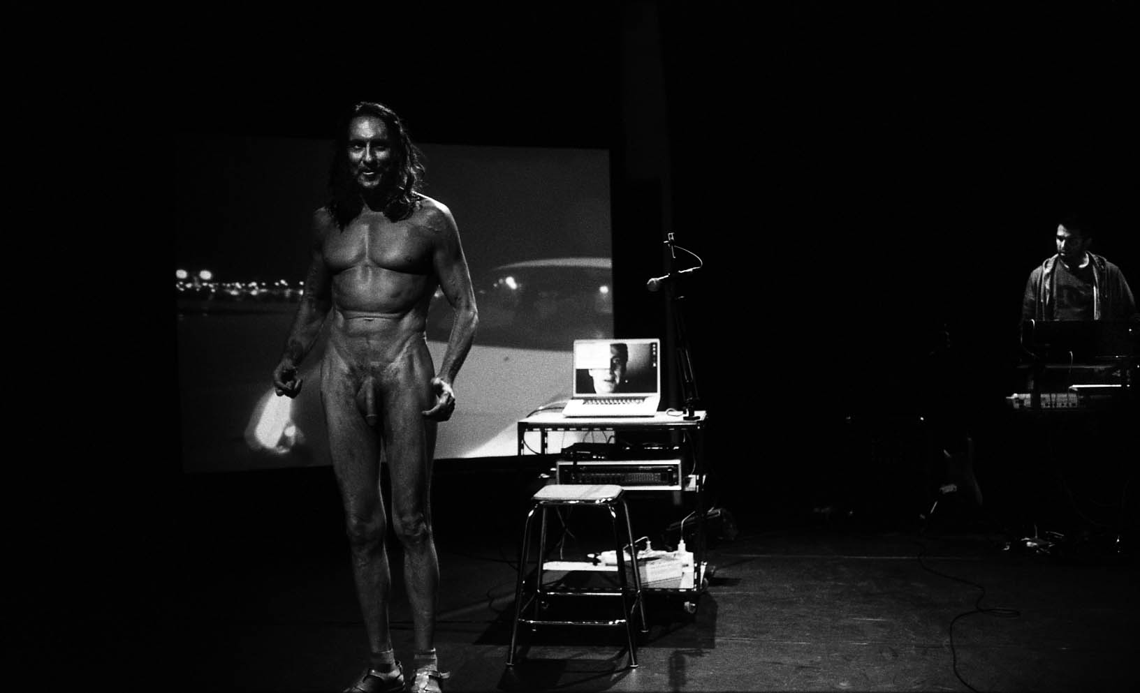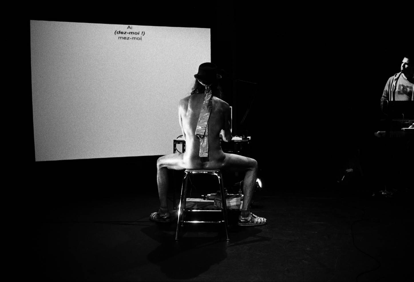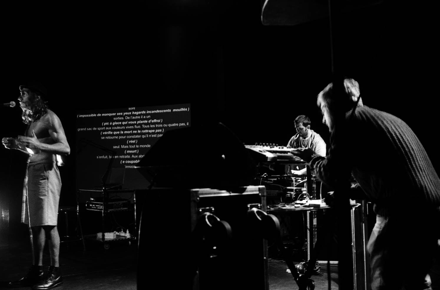 Cette performance texte-vidéo-musique est composée principalement du récit «P’tit-Luis dans la rue», entrecoupée d’apostrophes au public qui se présentent comme de la théorie dialoguée, des anachronismes d’imaginations ou des fantasmes : l’envie de dire des choses qu’on ne doit pas dire, échappées de mutités pourquoi pas, et dont le résultat narratif est à la fin supérieur à la somme des parties. Les récits ne se heurtent pas – ils se creusent … et à la tombée de la nuit projettent des ombres sur les murs.